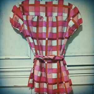 Super cute NWOT Banana Republic silk wrap shirt in pinks/red/coral & cream geometric check print. Great for the office or going out.