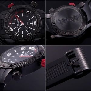 Black ion-plated stainless steel case with a black rubber strap. Black dial with luminous skeleton hands and index hour markers. Luminescent hands and markers. Date display at the 4 o'clock position. Quartz movement. Scratch resistant mineral crystal. Solid case back. Case diameter: 44 mm. Case thickness: 14 mm. Band width: 24 mm. Band length: 8 inches. Tang clasp. Water resistant at 200 meters / 660 feet