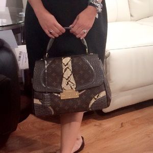 EXTREMELY RARE limited edition Louis Vuitton bag is the ideal mélange of signature style united with the captivating qualities of exotic luxury. This glamorous collectors piece features the instantly recognizable LV monogram adorned with shiny Vert porosus crocodile, natural python, black patent leather piping, and shiny gold hardware which can be locked with the accompanying key housed in a matching crocodile clochette. Four gold feet protect the bag at the base. 13" L X 10" H X 5.5" . 5" drop