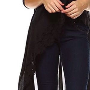 Gorgeous black top with a front asymmetrical front panel that drape to a fluttery cotton embroidered lace hem. Chiffon in the back and lace panel gives a moser not edge.