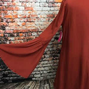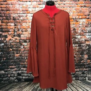 Bell Sleeve Lace-up Swing Dress. Color- cinnamon. Beautiful bohemian flair! Lace up Neckline. Belled sleeves. 100% Rayon. Machine wash cold.
