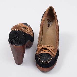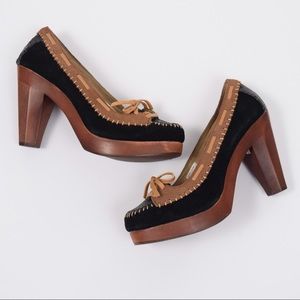 Wooden chunky heel pumps from Very Volatile. Rounded toe with loafer style stitching a lace. Black and brown suede body. These are new without tags/box. Size 8.5.