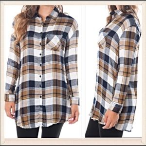 Perfect Plaid striped in Tunic Length. Long enough to wear with leggings or your favorite jeans. Great layering piece to wear buttoned or unbuttoned. Lightweight, soft rayon in tan/gold/mustard/black/white. S M mustard