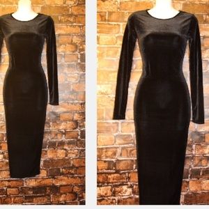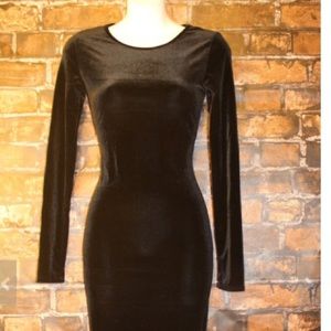 *Classic cut black velvet body-con long sleeve dress. Featuring a back slit and rounded neckline*