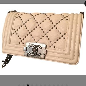 Authentic Chanel boy bag SALE!!! Cream color with stud details. Small size. Ruthenium hardware. Comes with tags dust bag chanel box & authenticity card! Preloved used carried but no damage no rips, tears or holes. Good used condition.