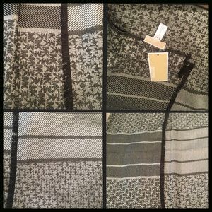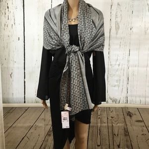 NWT. MICHAEL KORS SCARF/WRAP Patches of light and dark MK logos. Measures 24" X 64". Color is black, Grey/silver.