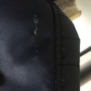 Navy blue hipster faux leather peplum jacket small tear back of right sleeve reflected in price as well as some peeling/cracks at collar and on back