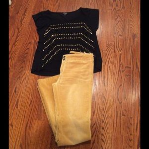 This pants are stunning velvet. Color is a camel gold color that is very rich looking. Pants are like new. Worn a couple times. Rise is 8 1/2 and inseam 31".