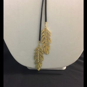 A super chic wrap necklace that mixes the sparkle of a gold tone chain with the versatility of black suede. Adorned with gold tone feathers embellished with crystals this is a true statement necklace. The entire wrap necklace is 64" long from feather tip to feather tip. The gold feathers are 2 1/2" long and just under an inch wide.