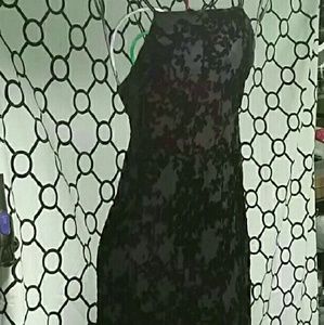 NO OFFERS PLZ. FINAL MARKDOWN.THANKU:-)Textured design layered on top of a sheer style silk material with a slip of the same material built in. Hugs curves. Criss cross style around neck. Long ,sexy,flattering black dress. 100%polyester lining. She'll is silk and rayon. Knock em dead. I can't model cuz it won't fit and ruins the whole thing.free gift(s) w/all purchases