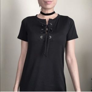 Very comfortable everyday wear. Lace up front dress. MADE IN USA. Made 51%poly 16%cotton 21%raton 12%acrylic . Size S LENGHT :35", bust:36",w:34". Size M LENGHT :35" bust:37" waist;35". size L LENGHT :36",bust 38, waist 36".