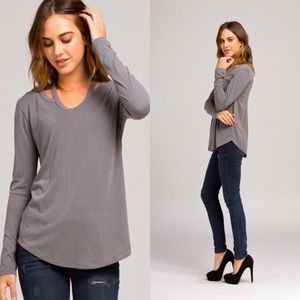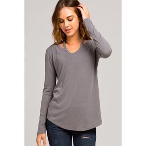 Semi-loose fit, V-neck, long sleeve. Has cutout detail at sides of neck and rounded hens. Has a very soft velvety silk feel. Has good stretch. 73% modal 27% polyester. No trades. No lowball offers. Also available in burgundy.