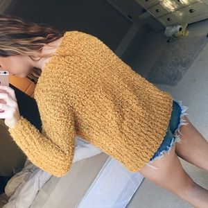 gorgeous mustard yellow colored sweater with a sheep-like material. so soft and comfortable! absolutely love this sweater. the v-neck gives it so much feminism and character. super cute worn off the shoulder or just regularly. pair it with a bralette for a more hipster vibe. size small, but could also fit a medium!