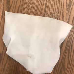 95% POLYPROPYLENE, 4% POLYAMID, 1% ELASTANE. Hat is white and has been worn. This is from the original runway collection. The cage has a small tear in one area. It can be mended or worn as is as once on its really not noticeable at all. Inside has a tiny hint of makeup residue but can be easily cleaned (see photo of hat with wood background. Last photo) Small spot on back of hat