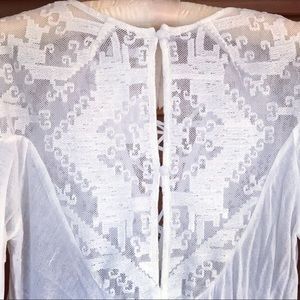 Boho-femme bell-sleeve blouse from Urban Outfitters with lacey details. Babydoll silhouette with lace-up chest and patterned lace insets at the yoke and shoulders. Rayon. Length 24". Color is ivory. Sold out at UO.