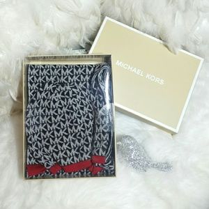 Michael Kors BOXED gift set including scarf, gloves and beanie plus orginal Michael Kors Box. Colors are black and gray with a pop of red trim! LOVE IT!! Make this the perfect gift for yourself or someone you care for!!