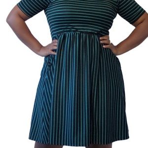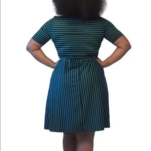 Emerald and black striped fit and flare dress. Tights or bare legs, YOU decide! Let this dress carry you through the Fall season in style. Approx. 36" in Length. 95% Polyester, 5% Spandex.