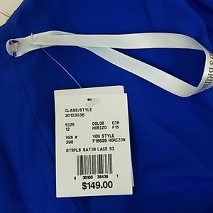 •New w/tags,beautiful bright blue satin dress w/ black lace accents.