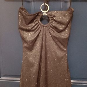 Beautiful halter dress with handkerchief hem adorned with gold sparkles all over. Worn only once. Great for holiday parties!