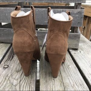 Vegan Brown Suede! Pull on styling. Studded. Heel is 4 inches. NEW without box but has slight wear to suede - not noticeable when worn. Price reflects.