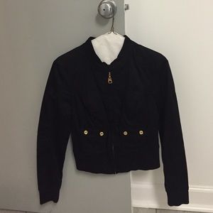 This is a beautiful black jacket it is not Jean. It has a beautiful gold zipper. Size small.