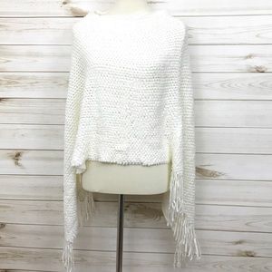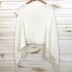 Super soft knit poncho with fringe hem. No sleeve hole design. Raw neckline. Measures 19" down center (shortest length)