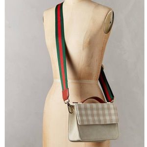 It has a green and red strap to it, plaid squares on the back and front also has a handle if you want to take the Straps off, very cute and comfortable to wear with any outfit