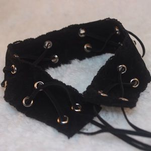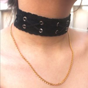 CONSTTANT Handmade Faux Suede Lace Up Choker ••• The "Fitz" choker is made of a black suede with grommets and faux suede black lacing. Perfect example of immaculate simplicity of black on black. The grommets add a slight but nice contrast to the black and an edge and romantic feel to any outfit. Tie the ends on the front or back for two completely different looks❣️Pair it with a off the shoulder top. Body Width is 1.5" Body Length is 12.5" + Ribbon Lacing ⭕️No Trades⭕️