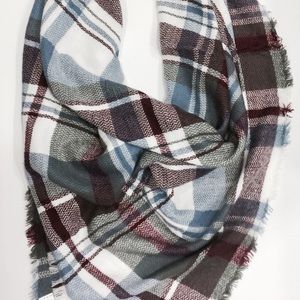 Give the gift of luxury! Silk and Pashmina blanket scarf. Winter white background with gray, wine and blue plaid. Fringe edges.