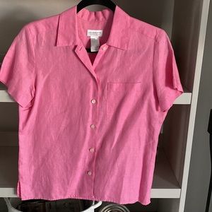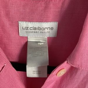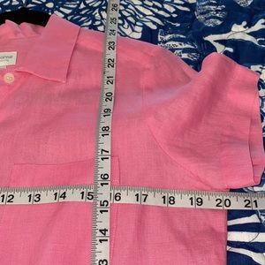 True vintage! Amazing condition!! Literally looks new. 100% linen shirt with clean, classic lines. Imagine a Hawaiian shirt cut minus the loud print. Looks modern like something from Madewell or Quince. The very pretty color is a nice contrast to the intentional minimalist cut. Made of really good linen material, ideal for hot summer days! Looks great casually worn over white linen pants, chinos, or denim. Can be tucked for a clean business look, even under suits. By Liz Claiborne, size medium. Measurements: pit 2 pit 21/ L 23.5 No flaws & I had it freshly dry cleaned. I have not worn it since it was dry cleaned. Flawless!