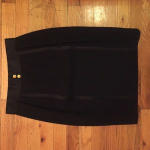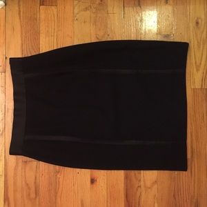 Authentic, vintage, black pencil skirt from Chanel. Wool blend with satin accents. This piece has been tailored to fit a smaller waist.
