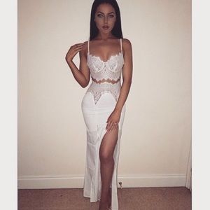 Features a delicate ivory/nude laced structure, sweetheart neckline, nude mesh waist, adjustable spaghetti straps, lightly padded bust, midi length with sexy thigh high splits and zip closure.