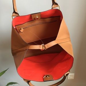 Large bag! One small inner zippered pouch compartment that is removable. Brand new with attached tags. Has metal feet on bottom of bag. Measures 13" wide at base, 21" wide at opening (when inner straps aren't attached), 13" tall x 7" deep. Does not have a crossbody strap.