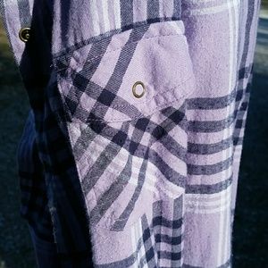 Long sleeve flannel shirt with snaps. Been wore and washed once. Light purple, dark purple and white(last pic shows true color). Just too big for me now.