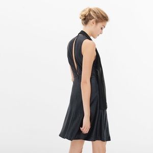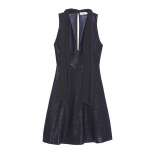 Super cute and flattering dress!! V-neck and removable black chiffon neck tie. Tag describes the color as black but this is a dark blue/black. Perfect condition.