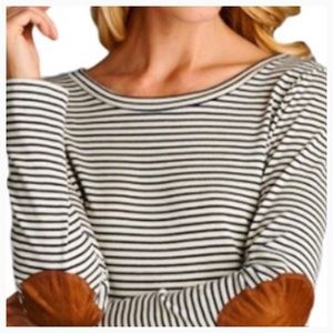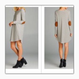 Casual and so cute! This dress features a rounded hem with contrast faux suede patches at the elbows in navy and white. Soft and lightweight, goes almost anywhere.
