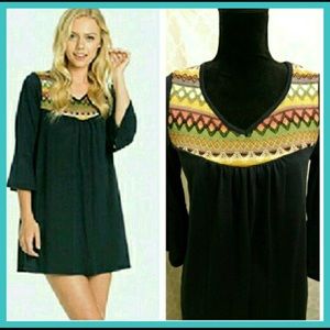 Beautiful and multicolored embroidery, flowy and feminine dress. Beautiful bell sleeves. Perfect long sleeve dress for spring!