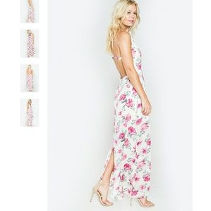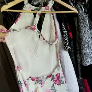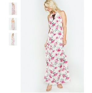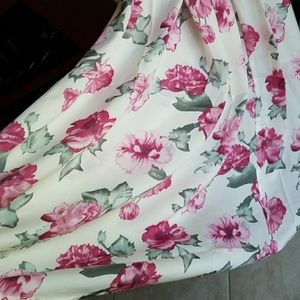 Wear this amazing floral maxi dress to your next dinner date with the beau. Features a black lace trim and a back slit. 100% polyester. Beautiful dress but runs small. Large fits about a size 8 to 10.