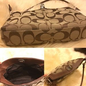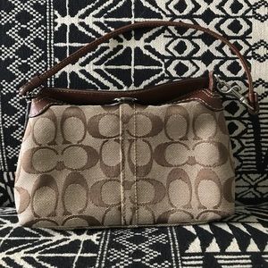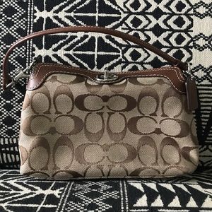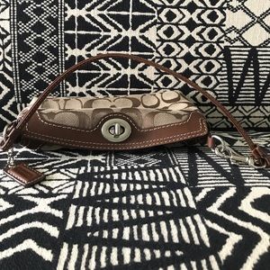 Beautiful classic Coach wristlet. Tan canvas with brown leather details. Will fit phone and small everyday essentials. In impeccable, excellent condition. New without tags. See photos for details. Twist lock.