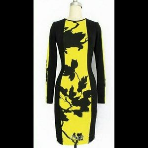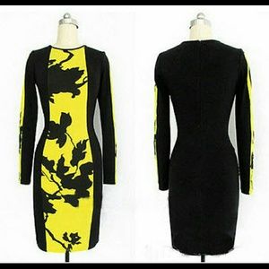 Black and neon yellow panel dress with black silhouette stylized floral design on neon yellow background. Same print on panels down each arm. 95% polyester, 5% elastane. Worn only once. Great condition. Made in United Kingdom. Length: 32.5". Waist: 28" - 34". Hips: 32" - 38".