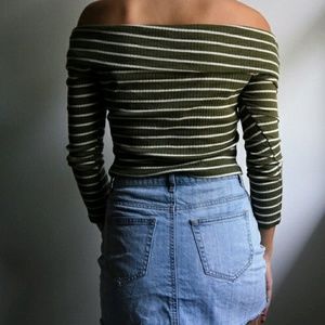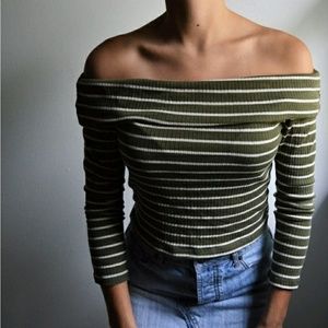Ribbed off shoulder crop top with long sleeves! Run a bit small. Size up if in between sizes.
