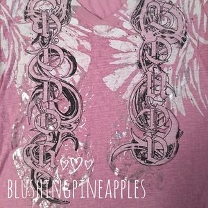 White, grays, silver intertwine and spell the word 'honor' on both sides of the shirt. Perfect with jeans and boots. No stains or holes either.