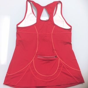 Athleta Energy Tank. The color is a red with orange stitching. Features built-in sports bra with anti-chafing lining (feels similar to scuba material), rear zip and open pockets, and reflective trim. Size small. Great for running, cycling, hiking, yoga.