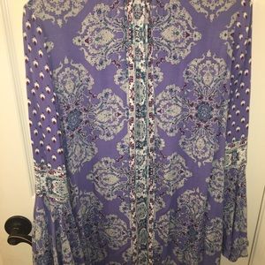 In an effortless silhouette this printed tunic features exposed button detailing down the front with a V-neckline and ruffled collar. Long sleeves with statement flared cuffs.