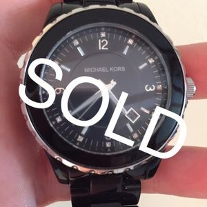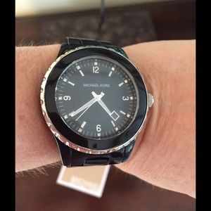 MICHAEL KORS QUARTZ, BLACK DIAL WITH SILVER ACCENT AND BLACK PLASTIC BRACELET, BAND WATCH MK5248. This is a excellent preowned watch. Has everything, box, instruction manual, pillow, and just replaced the battery. Even comes with a couple of extra links. The watch is 6 1/2 inches fully closed and open it measures 9 1/4 inches. The 2 extra links measure one inch. See photos for more condition details. Thanks for looking. Valentine's Day coming soon, great gift for her.