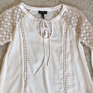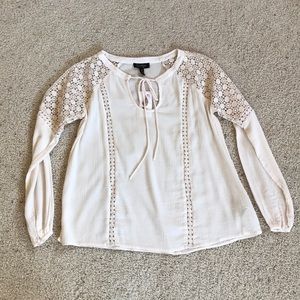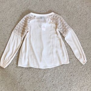 NWT, Jessica Simpson, Lace Peasant Top! Long sleeve blouse with lace shoulder detail and front trim detail. Tie keyhole neck, long sleeve with button cuff closure. Super cute top! Made of 54% cotton, 46% viscose. Lace 100% polyester. Cream in color. Size XS. 🚫No Trades