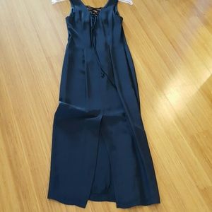 Sweetheart neckline. Sleeveless lbt. Button front, V-back with cross tie detail. 15" slit in the back. 50% acetate, 50% rayon. Classy for any dressy occasion.