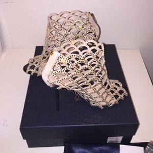 Brand-new, tags on never worn classic stiletto!!! Size 40. Shimmering Swarovski crystals wink from the scalloped lattice on these peep-toe Sergio Rossi booties, exuding pure glamour and romance. Satin toebed. Hidden heel zip. Suede-covered stiletto heel and leather sole.