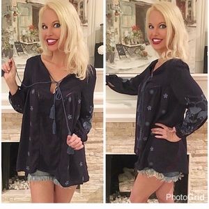 Long sleeve yolk tie front embroidery detail tunic top. 100 % cotton length 30