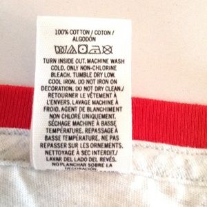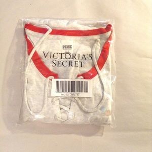 Pink night shirt features a lace-up style with logo back design. Night shirt is gray with red color-block neckline and dog logo on front right side, with multi color lettering on back. Night shirt is new still in packaging size small,